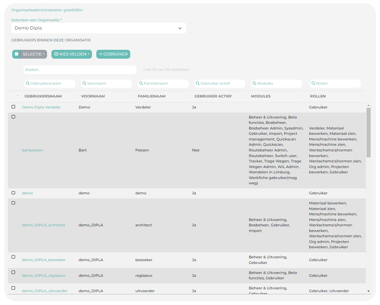 Bij Rollen bepaal je wat de gebruiker mag zien en bewerken. Gebruiker in deze organisatie moet altijd aangeduid zijn.