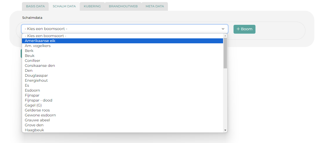 Kies een boomsoort en klik op + Boom