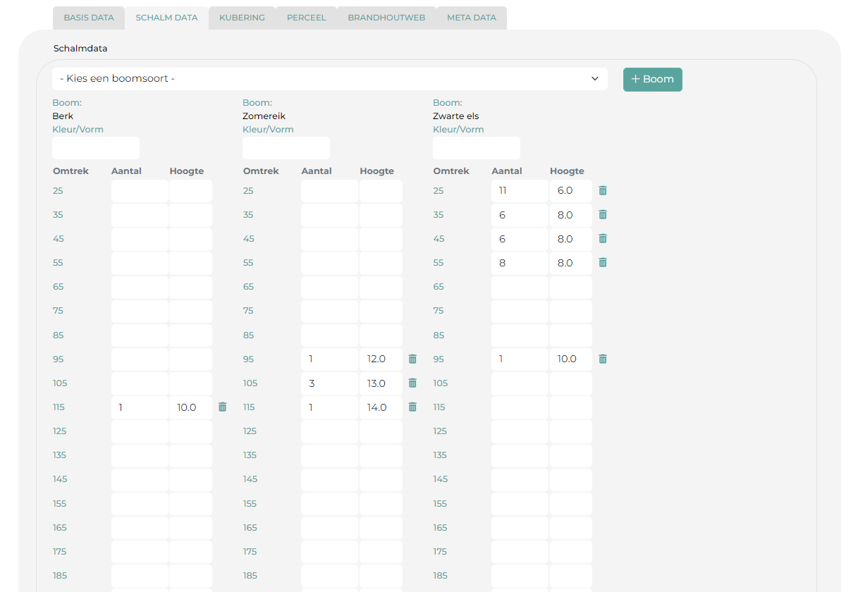 Om een nieuwe boomsoort toe te voegen, selecteer je bovenaan weer de juiste soort en klik je op +
