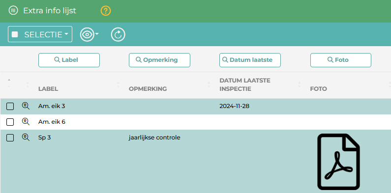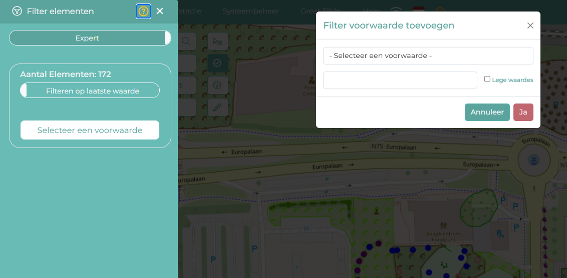 Via de Extra Info tabel: maak een selectie op de kaart en gebruik in de tabel de filters boven de kolomkoppen om gericht te zoeken binnen je selectie