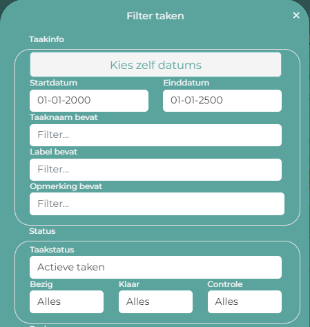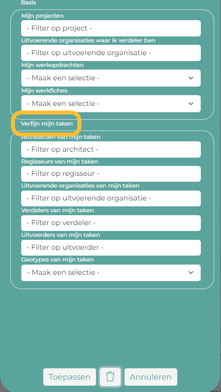 Afhankelijk wat je bij Basis kiest, zullen de velden bij Verfijn aangepast worden en toegepast worden op de takenbundel die je bij Basis hebt gekozen. Dus niet meer op 'mijn taken'.