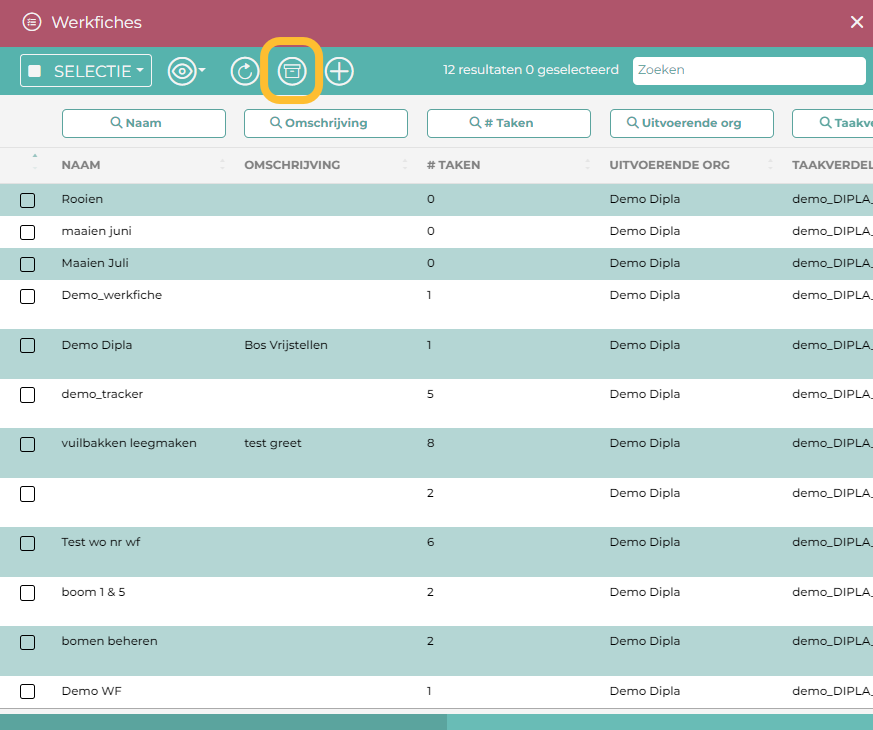 De kolom 'status 'opent zich automatisch, zodat je duidelijk kan zien welke werkfiches actief, en welke gearchiveerd zijn