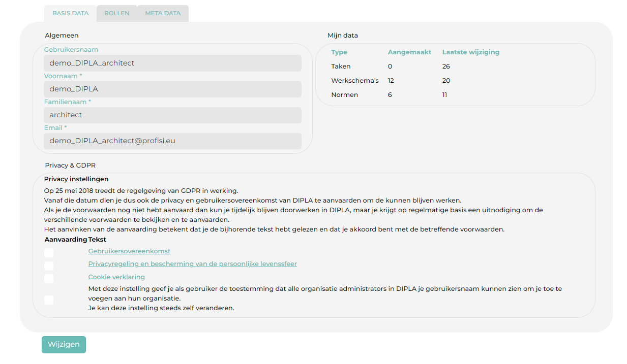 Hier vind je je algemene gegevens terug. Je kan je voornaam, familienaam en emailadres wijzigen. Je gebruikersnaam kan nooit gewijzigd worden, want al je acties binnen Dipla hangen hieraan vast.